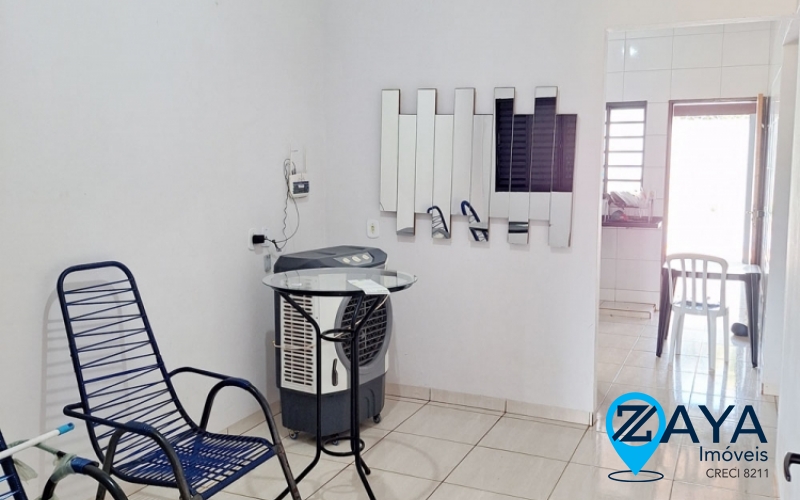 Casa com 2 quartos, sala, cozinha, banheiro, área de lazer com churrasqueira e piscina e garagem.