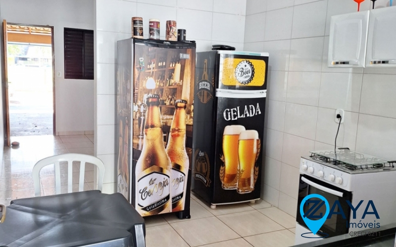 Mesa de sinuca, 1 freezer e 1 geladeira, fogão, bebedouro, ar condicionado em um quarto, climatizador móvel, 1 cama de casal, 1 colchão de casal, mesas e cadeiras.