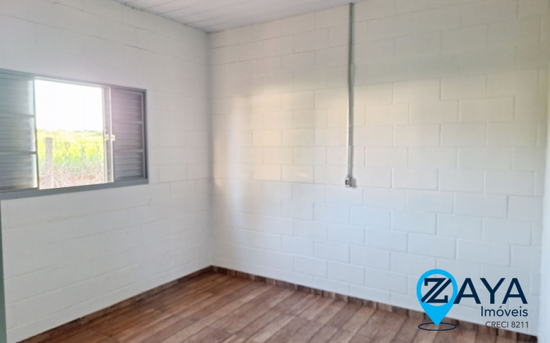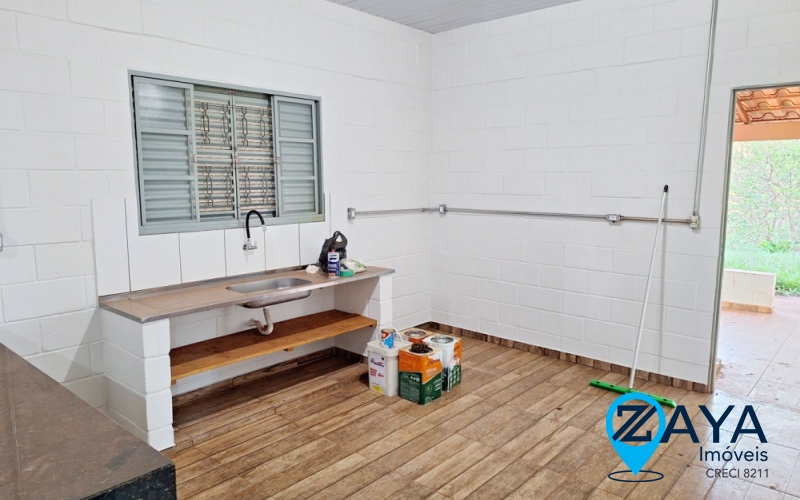 Casa com 2 quartos, sala, cozinha, área gourmet com churrasqueira e fogão à lenha, área de serviço e garagem.